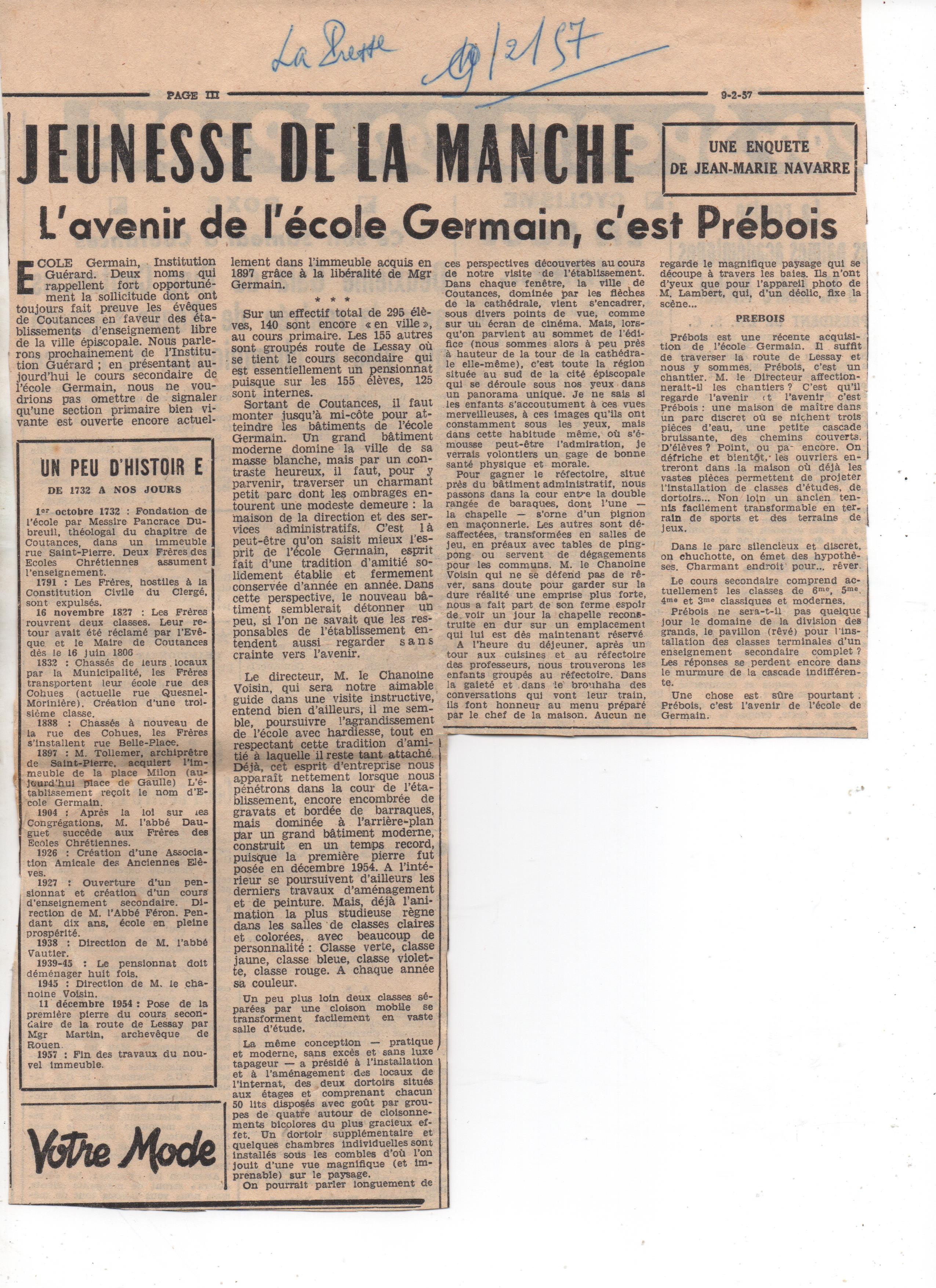En faisant du tri dans le local de l’association des anciens élèves, nous avons trouvé un article de La Presse de la Manche daté du 9 février 1957 et signé Jean-Marie NAVARRE. Cette enquête propose une visite de l’École Germain et retrace dans un encadré son histoire de 1732 à 1957.